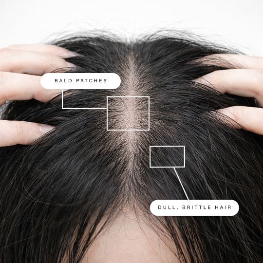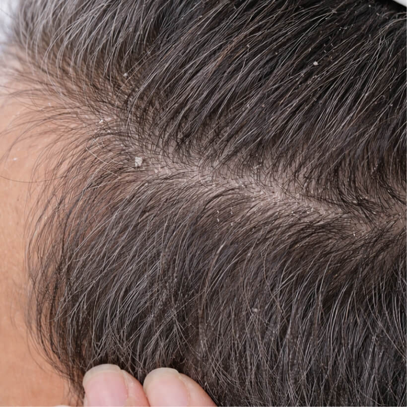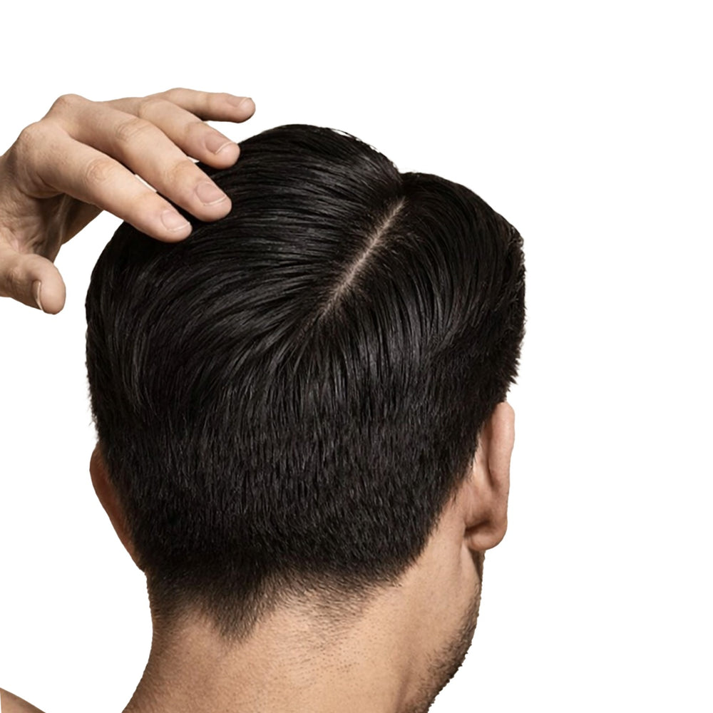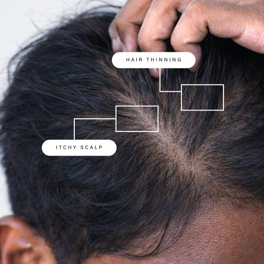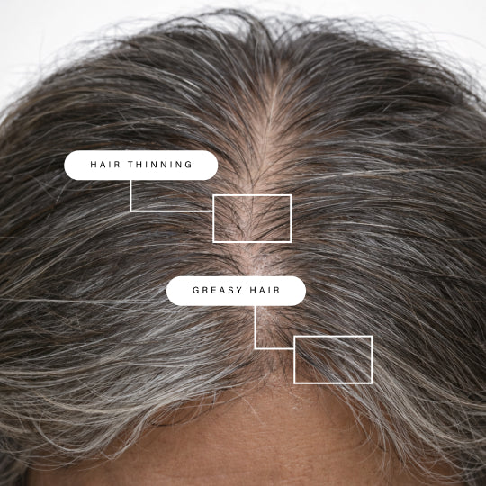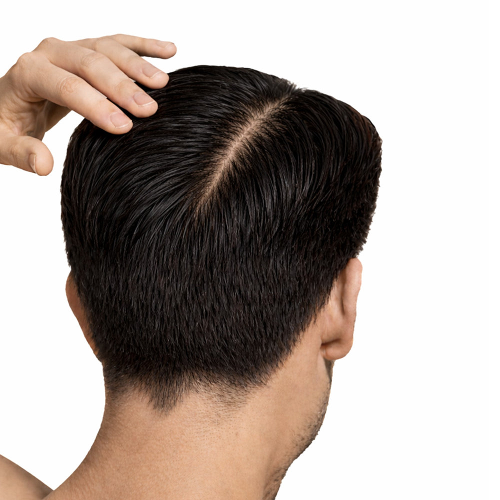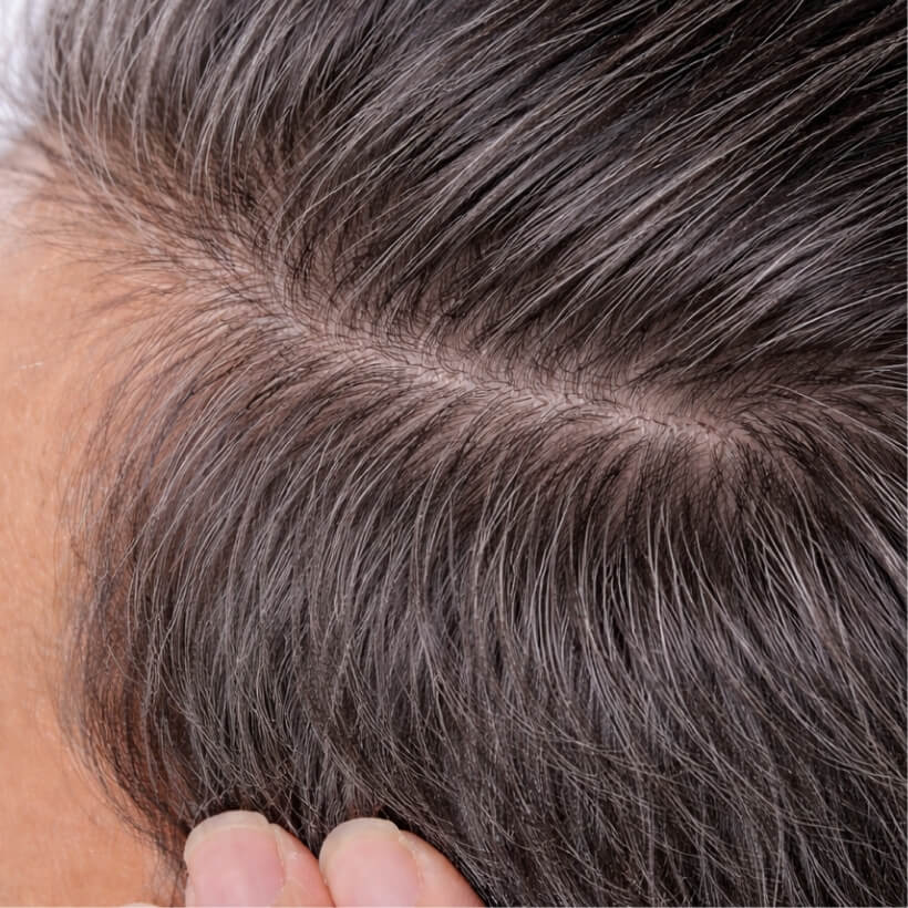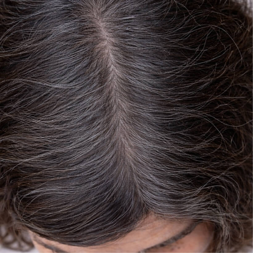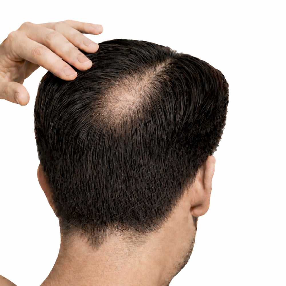 You notice clear temple recession and a receding hairline; crown thinning may start and your part may widen in daylight.
